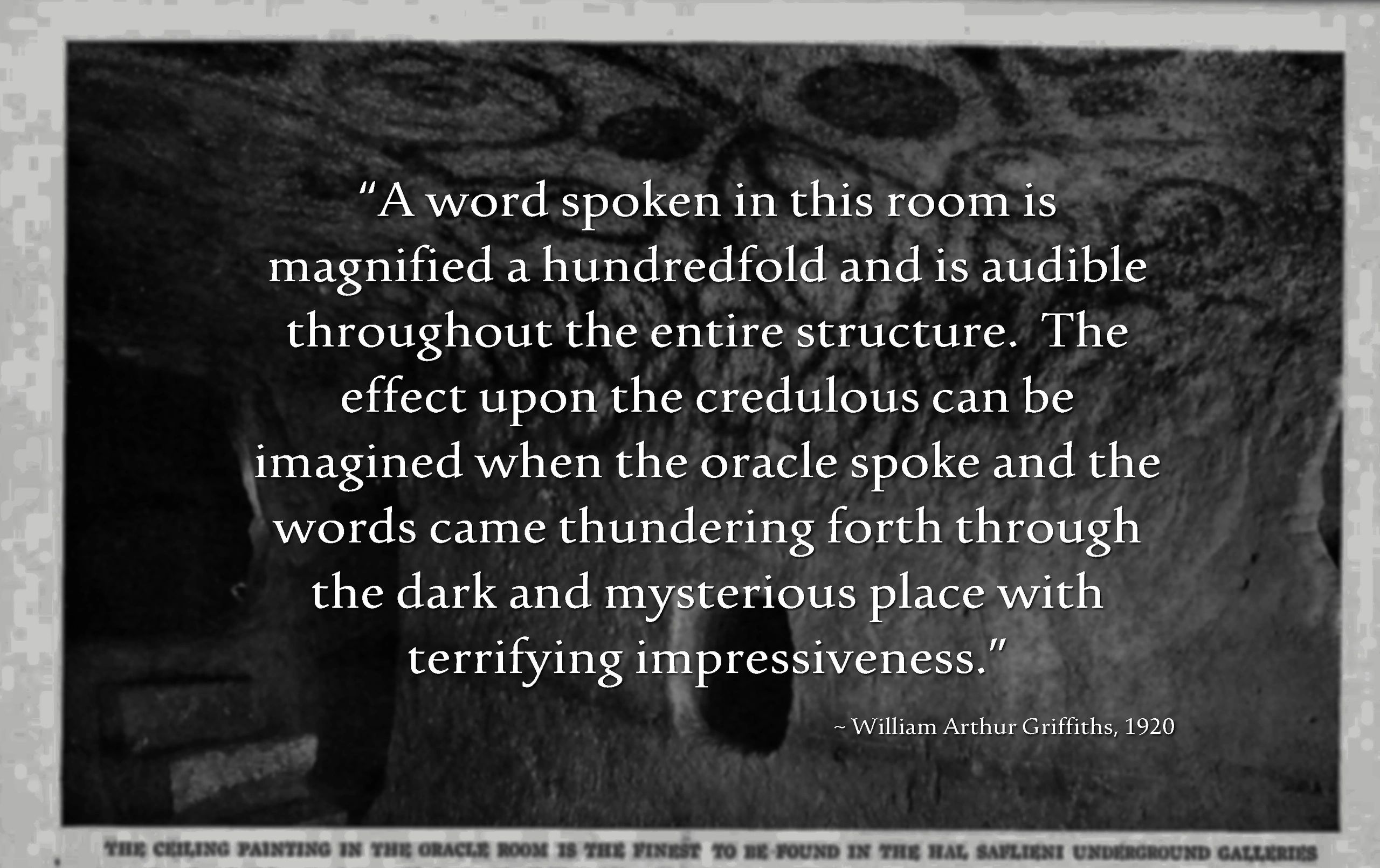 Archaeologist and Psychologist, Dr. Torill Christine Lindstrom writing with Anthropologist Dr. Ezra Zubrow states: “We regard it as almost inevitable that people in the Neolithic past in Malta discovered the acoustic effects of the Hypogeum, and experienced them as extraordinary, strange, perhaps even as weird and “otherworldly”.